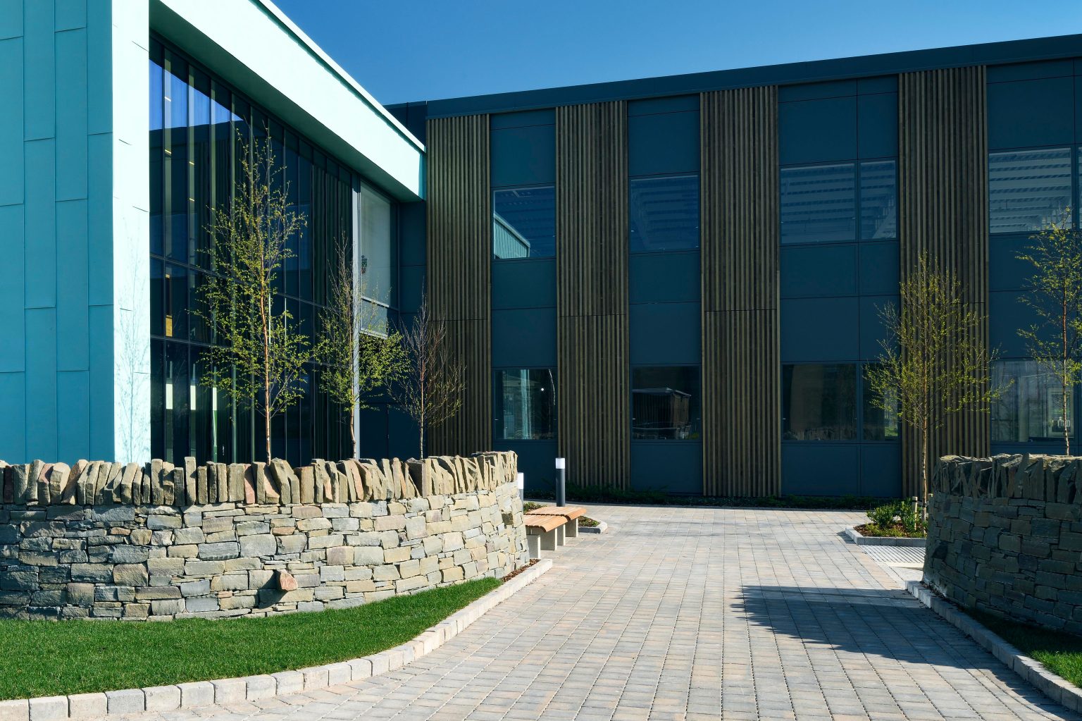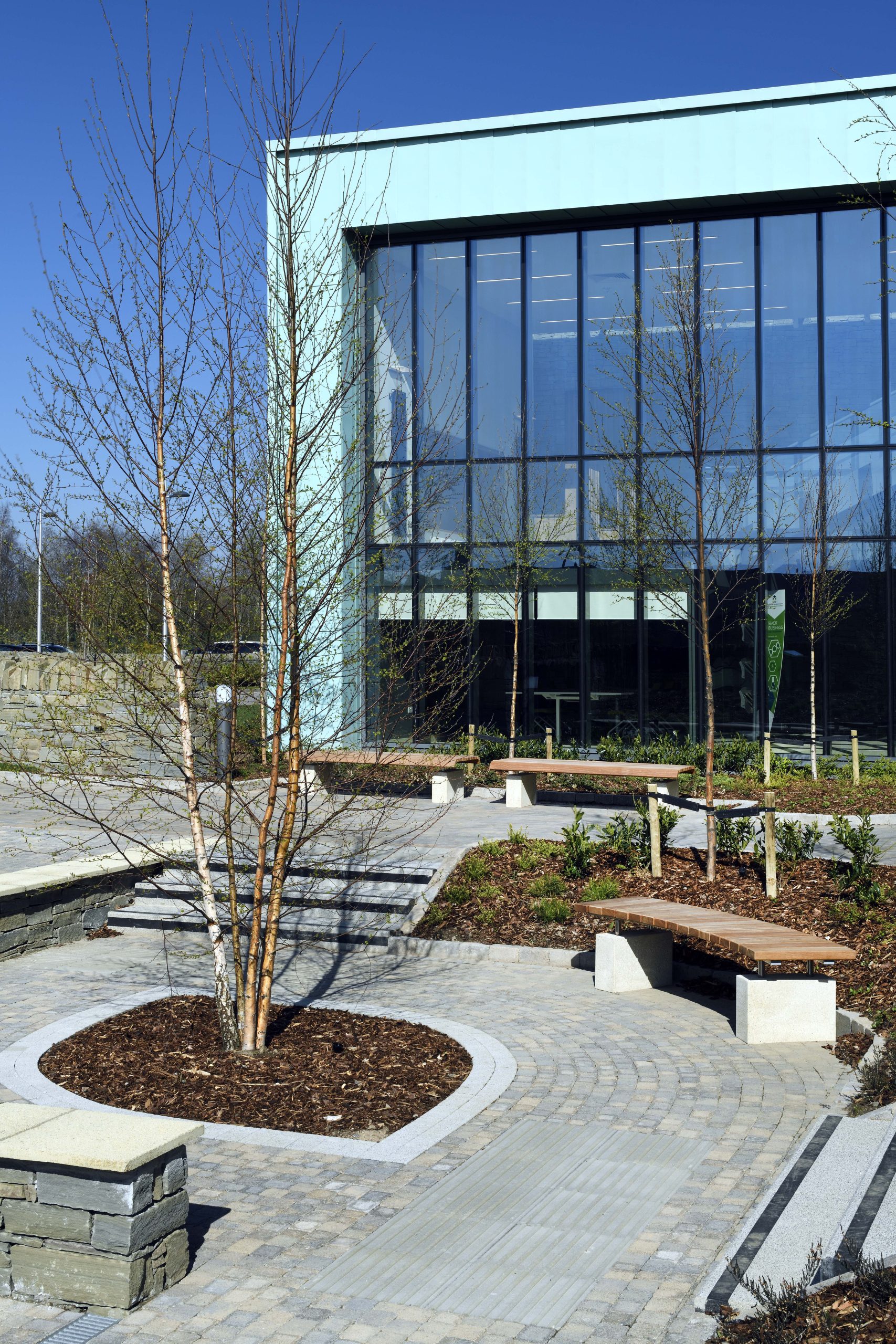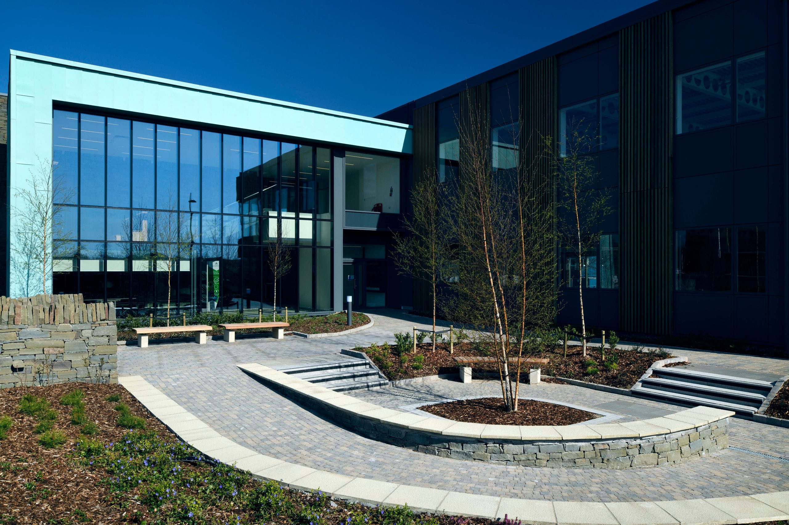 Similarly, the landscape adopts the design codes and materials of the earlier project to compliment the new building concept, enhancing the entrance experience through the creation of a distinctive external space.