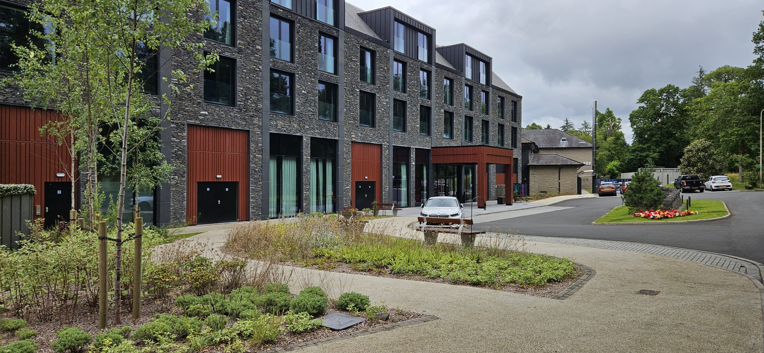 Site wide masterplanning was required to re-organise car parking, footpaths and vehicular access arrangements, as well as to position and orientate the new wing. The project also included the refurbishment of a disused walled garden for a new recreation space for guests and valet car parking. Proposals were developed and refined through an LVIA identifying key views and visual setting requirements, and a careful plan of tree protection and compensation planting to underpin the new landscape proposals.
