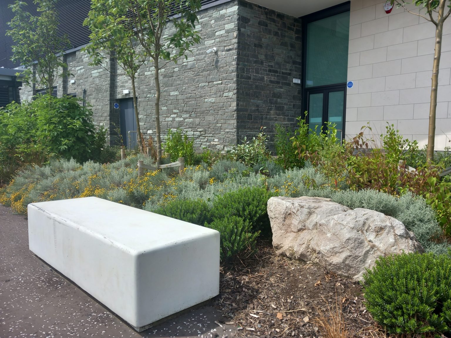 Limited planting areas have been carefully arranged with species to suit the prevailing coastal weather conditions and integrated into the overall design at key locations. The design incorporates a combination of native wildflower grass areas, laid as turf, with informal flowering shrubs, boulders, and multi-stem tree planting. The design assumes a level of rugged informality, where tree and plant growth will be sculpted by the wind as it establishes.