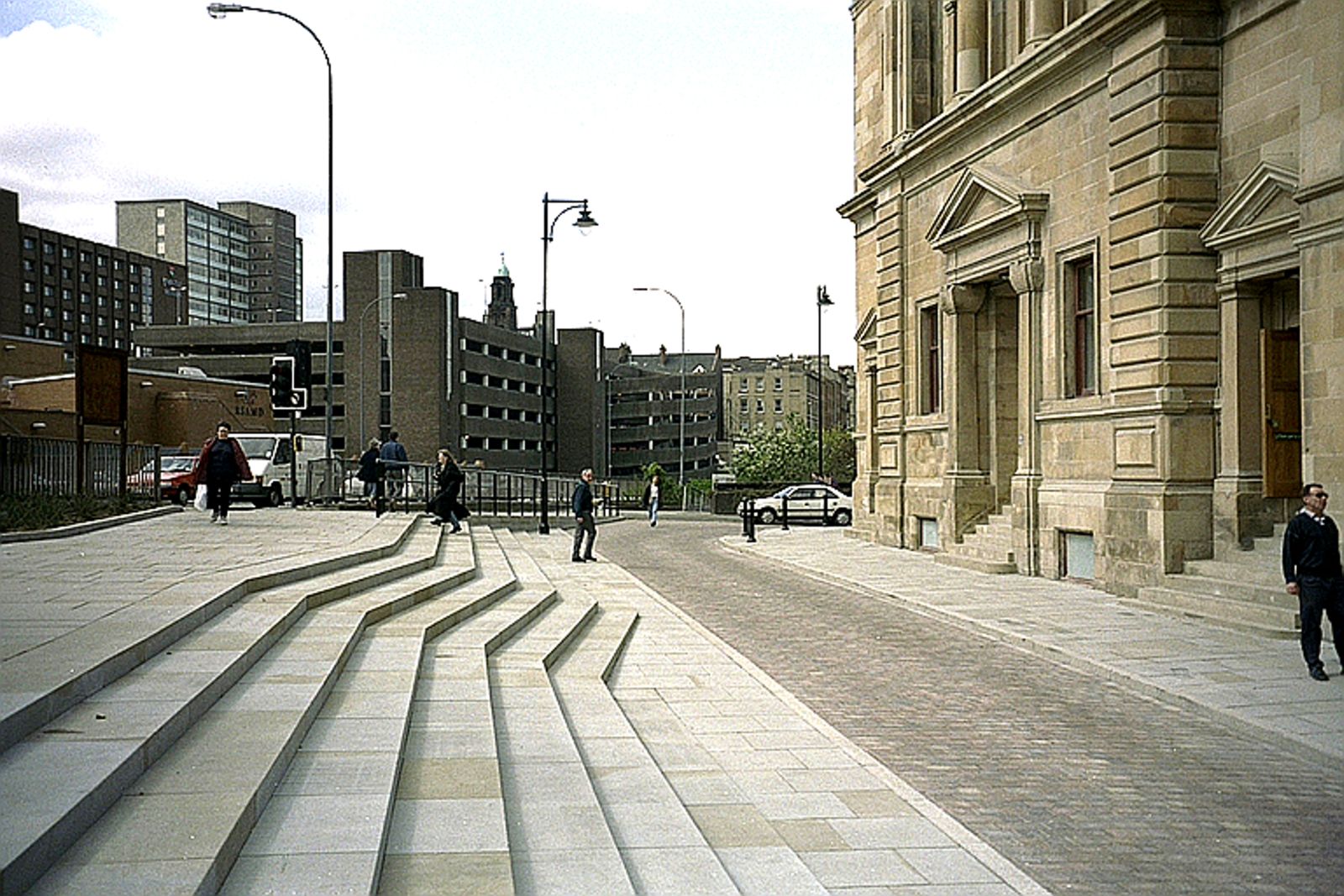 This project involved a comprehensive streetscape design immediately to the front, and side, of the Scottish Piping Centre in Cowcaddens, to provide a more suitable public realm and setting for this Grade “A” Listed Building.  The existing carriageway was resurfaced and the successful promotion of a one-way Traffic Regulation Order served to release a larger area for wider pedestrian circulation. The biggest issue, an awkward change in level between Cowcaddens Road and McPhater Street, was resolved through the combination of ramps and broad steps, which double as informal seating and create a large, open milling space more appropriate to the scale and function of the building.  Civic Trust Commendation 1998.