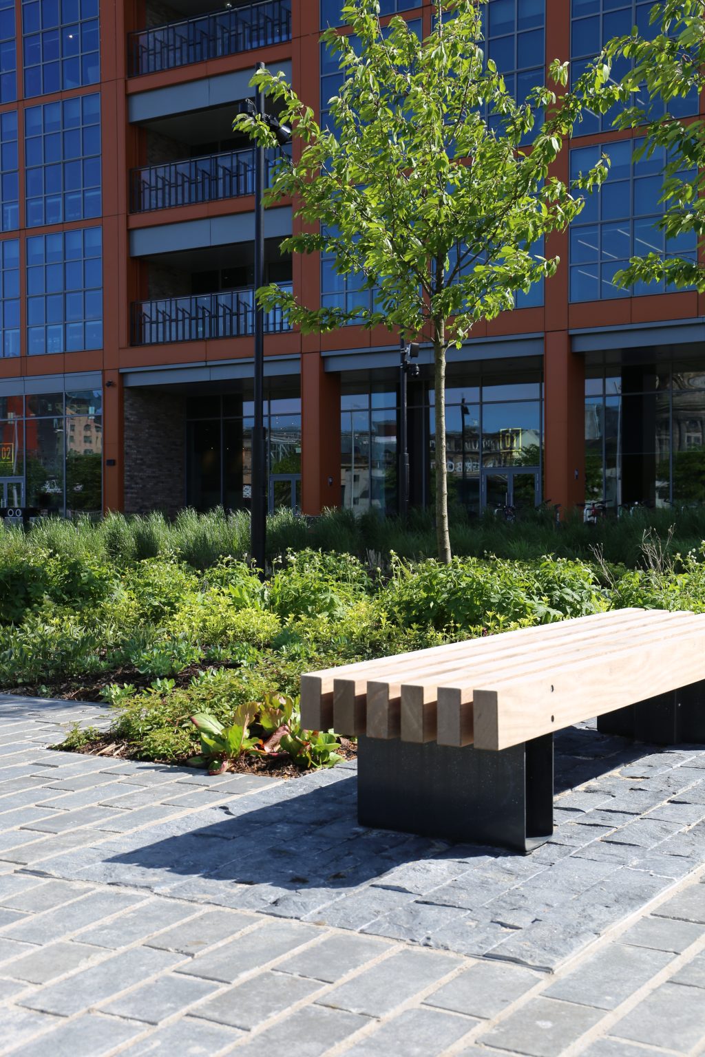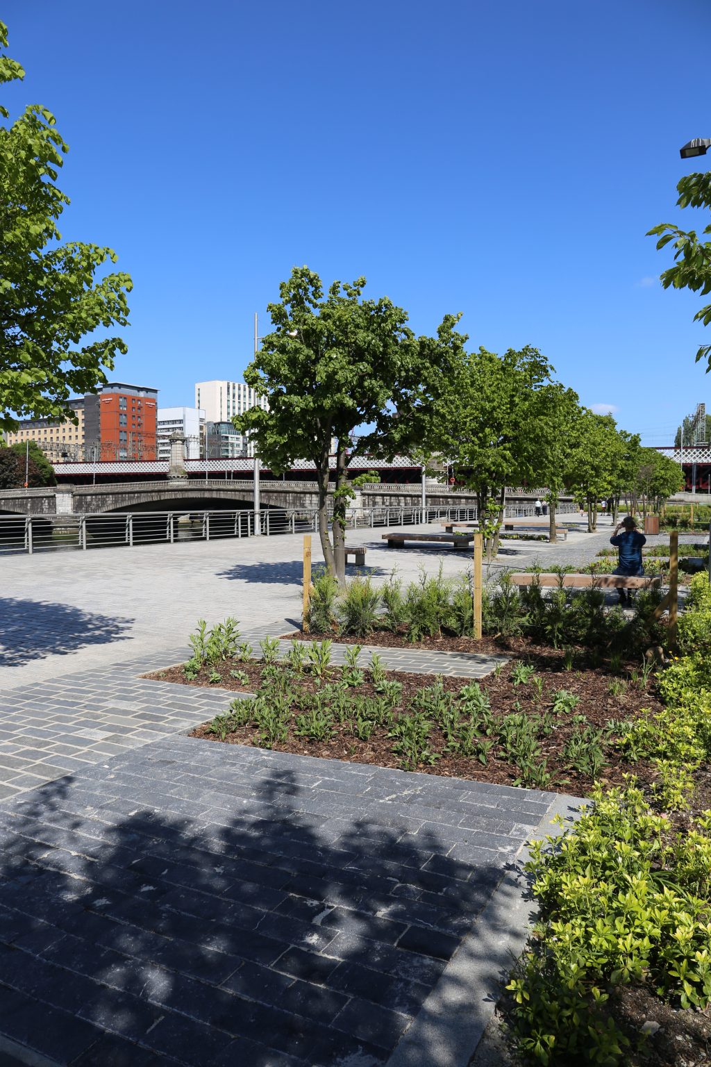 The sensitive material palette looked at re-using the existing paving, integrating new sections of Kilkenny paving to mirror the ripples on the Clyde and adding seasonal colour through a considered species selection.