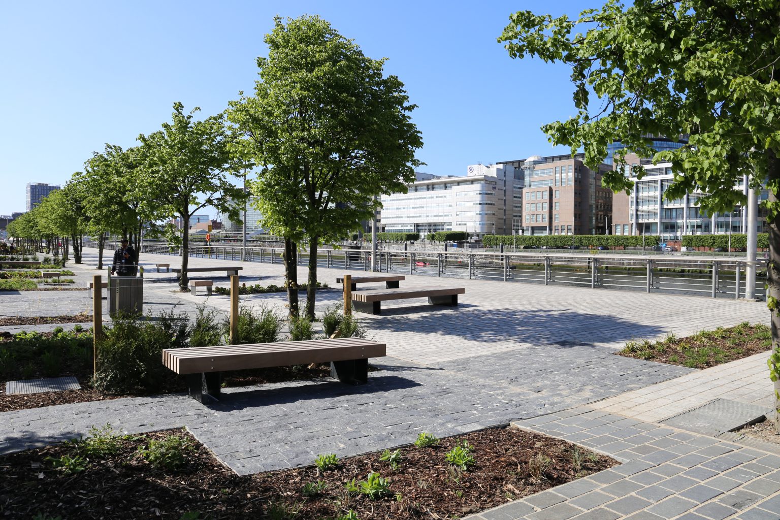 The prominent Barclays Glasgow Campus development along the Clyde Waterfront opened in 2021. This new financial tech hub comprises of office spaces, well-being facilities and exhibition spaces, however, in 2022 it’s interaction and connectivity to the Clyde was still to be refined. HLA worked closely with Graham Construction to enhance the pedestrian promenade and public space. The design looked at creating a high-quality piece of public realm which would enable users to interact with the waterfront better. It provided a series of seating areas and elongates the existing soft landscape in varying strips to help it bleed into some of the existing granite paving. The detailed design required careful understanding of the existing conditions to allow the allow the proposals to be integrated seamlessly.