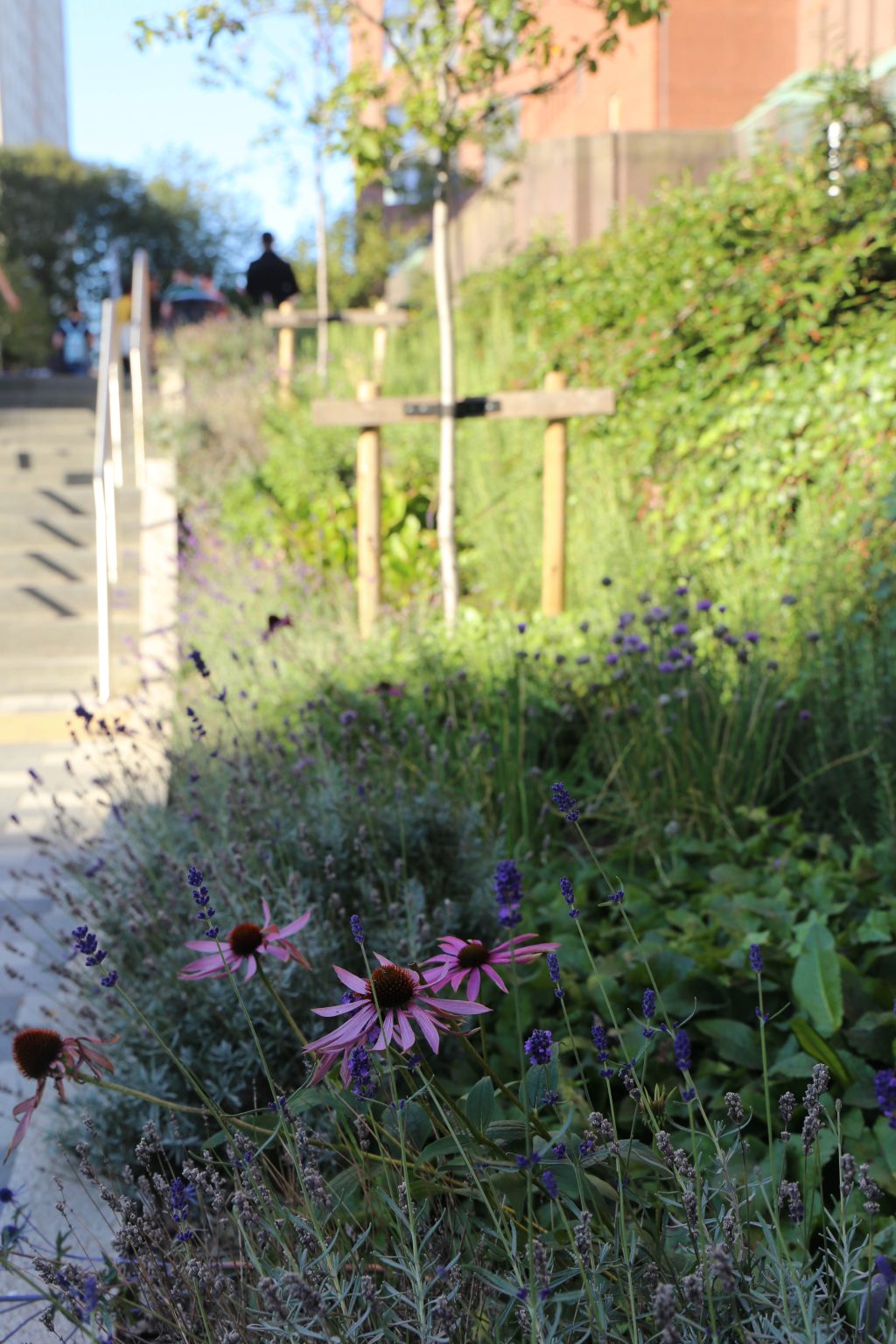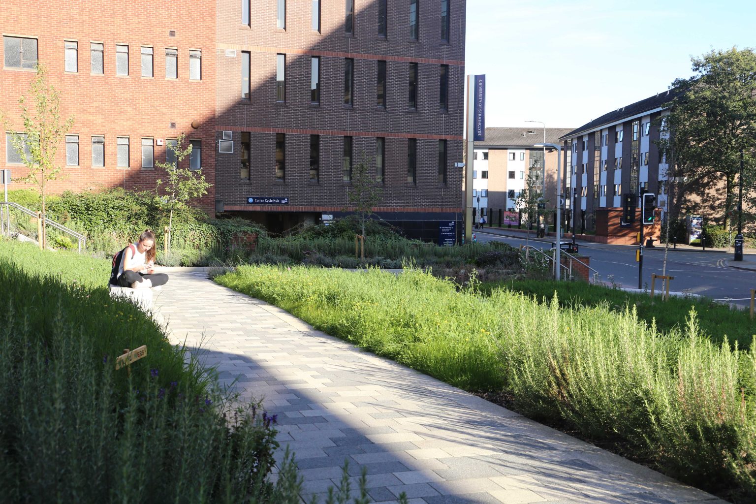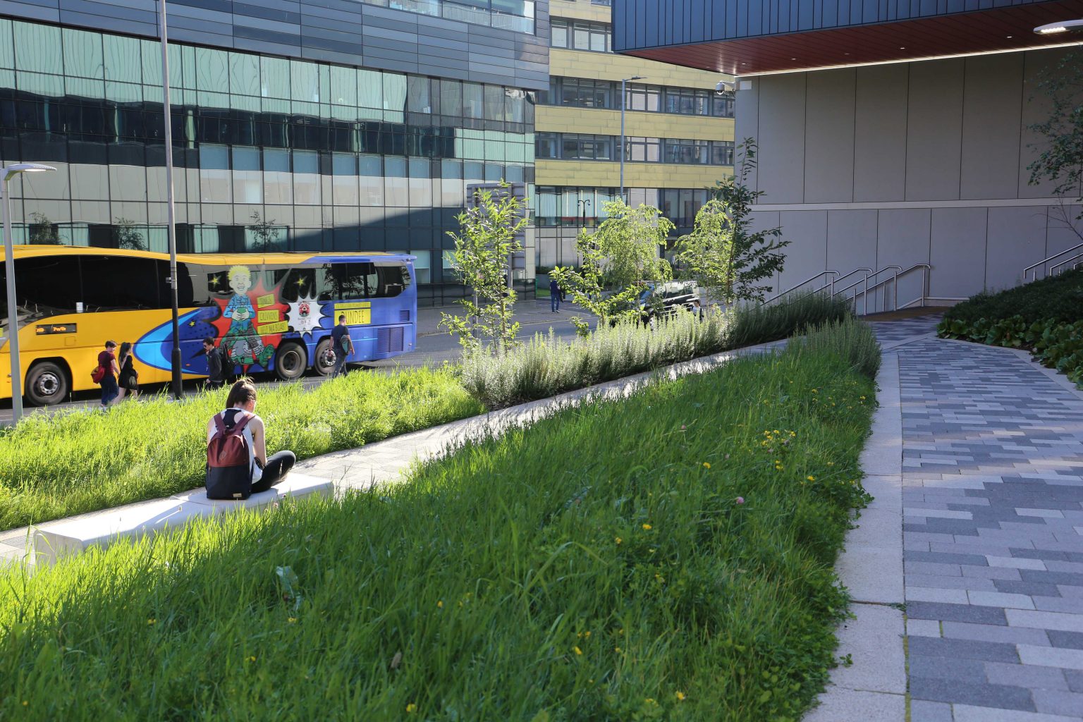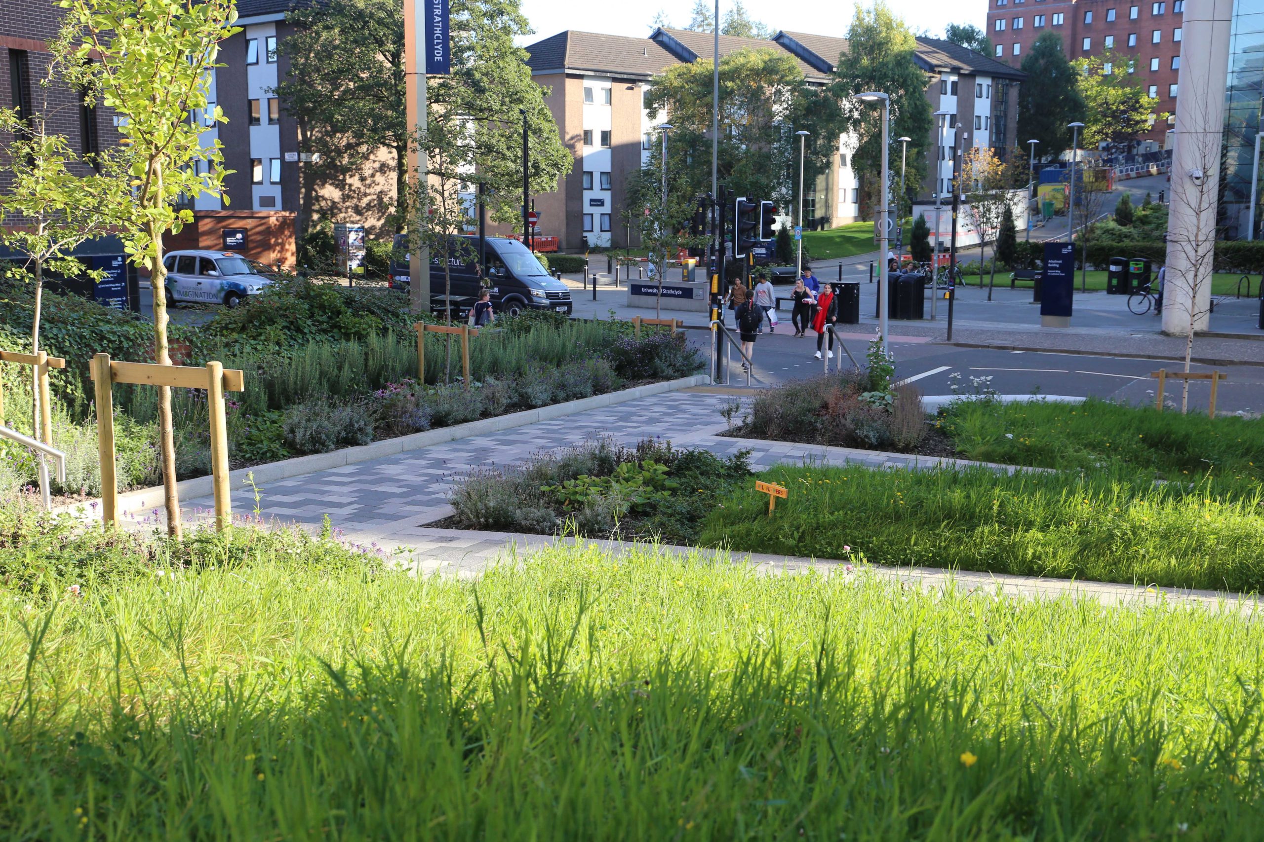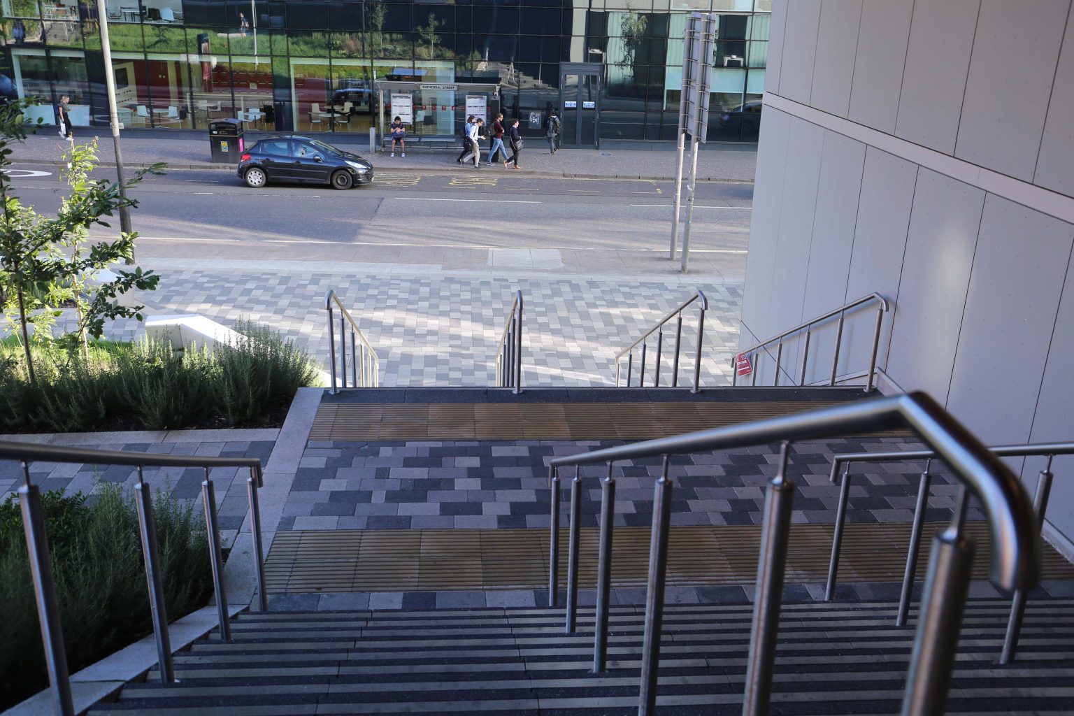 The design provides a vibrant and contemporary new city space, taking advantage of significant changes in level down to Cathedral Street to create a series of inclusive approaches combining steps and pathways set within a richly planted bank.  High quality paving and robust seating and edge elements are integrated with a series of lawns and landscaped spaces featuring native flora, tree and shrub planting, to create a robust and vibrant campus environment.